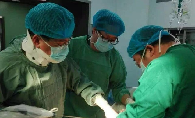 圖中帶頸托堅持為患者做手術的是洛陽新區(qū)人民醫(yī)院院長黃合超,2016年年底,由于工作勞累導致頸椎病發(fā)作,住院接受康復治療期間,適逢一個病人慕名找其做“腹腔鏡下胰十二指腸切除”……