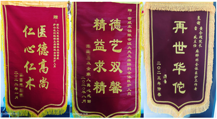 病人轉(zhuǎn)危為安,且親眼目睹了這一突發(fā)情況搶救、溝通、決策的全過(guò)程,真真切切感受到醫(yī)師發(fā)自內(nèi)心為病人著想的情懷,這一切都默默記在心里。術(shù)后恢復(fù)良好,一周后即達(dá)到出出院標(biāo)準(zhǔn),在出院當(dāng)天專門(mén)為麻醉科送來(lái)錦旗,這錦旗不僅是對(duì)我們工作的肯定,也是和諧醫(yī)患關(guān)系的見(jiàn)證。